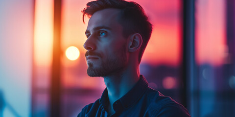 Profile of a contemplative young man, featuring a striking contrast with the vibrant sunset skyline behind