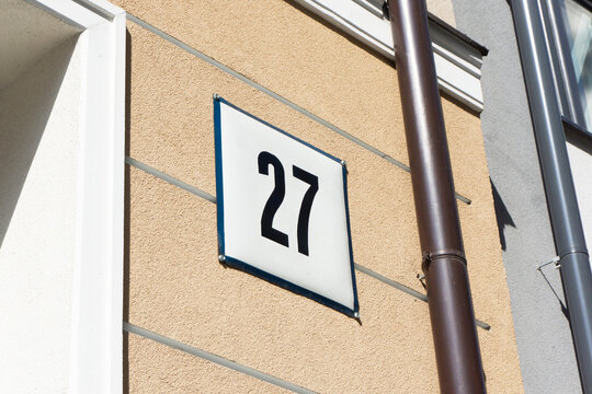 Street sign with number 27 on a square metal plate. Detailed view of a building facade with attached gutters. Address plate on a building background.