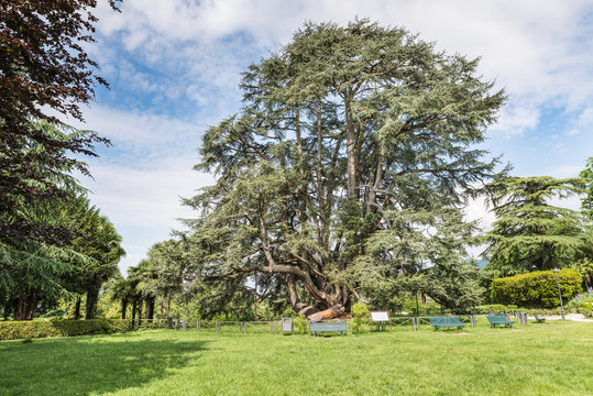 Monumental tree of Cedar of Lebanon (Cedrus libani) with circumference of about 11 meters (36 ft) and about 29 meters high (95 ft), public gardens or Estensi gardens, city center of Varese, Italy