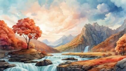 2d illustration of mountains and forest as a background with clouds in watercolor