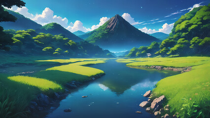 2D illustration of green meadow river waterway with trees and mountain under sunny sky