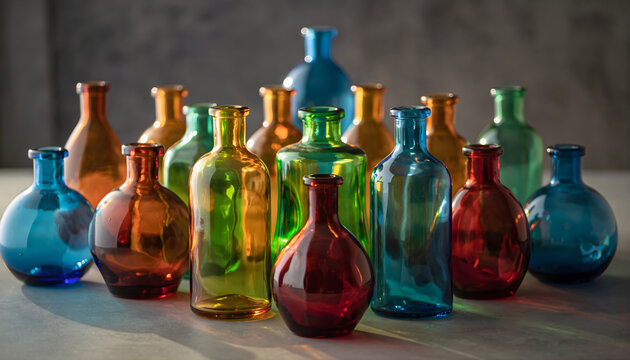 Glass bottle with frosted and tinted finishes in amber, pearl, jade, and terracotta with metallic accents, Luxury product display in 2k resolution