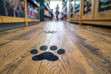 COVID 19 social distancing sticker with dog paw prints on a wooden floor in store