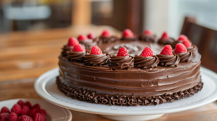 Rich and decadent chocolate cake with raspberry ganache and fresh raspberries on top. The cake is sitting on a white plate on a wooden table.