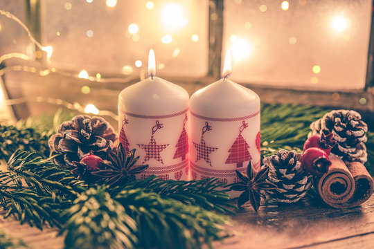 Beautiful holiday candles with winter nature