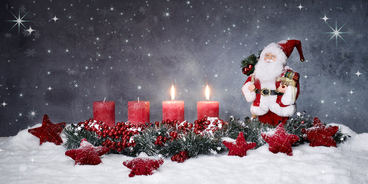 Second Sunday in Advent, four red candles, two of them are burning, fir branches and Christmas decoration on dark rustic wood, wide panoramic format with copy space