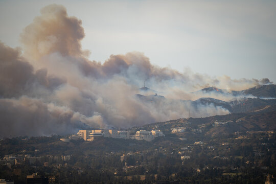 Wildfire in Pacific Palisades, Los Angeles, January 8, 2025, towards Getty Center and Brentwood. Images showcase dense smoke clouds, burning hillsides, and urban areas at risk. 2pm - 3pm.