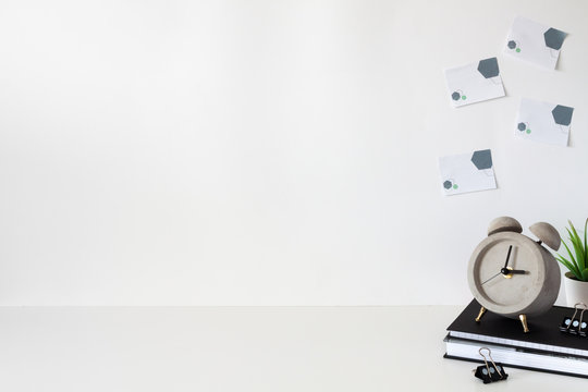 School desk against an empty white wall. Copy space. Books, succulent and alarm clock. Sticky notes.