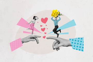 Creative retro 3d magazine collage image of excited funny couple celebrating love holiday together isolated white color background