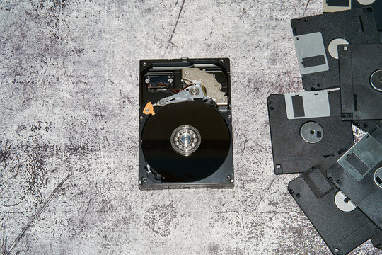 various old obsolete 5 inch and 3 inch floppy disk on white