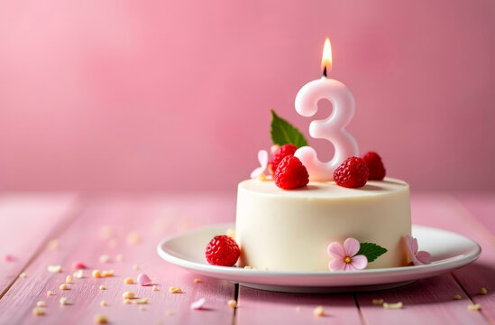 3 Year. Birthday Anniversary Sweet Cake. an anniversary greeting card or banner. Greeting Card, Banner with Burning Birthday Party Candle, Number, Flame. Design for Birthday Concept.