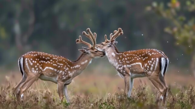 Close-up of a young spotted sika deer chital or cheetal with antlers grazing in the grass. Axis deer in the park is friendly to people, family Cervidae concept