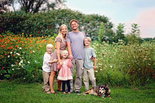 Happy Wholesome Caucasian Family and Dog Smiling and Posing by Flowers