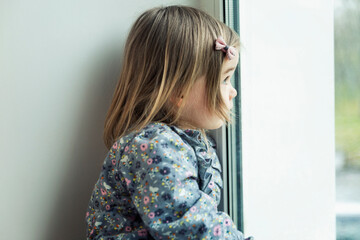 Smiling Caucasian toddler girl around 3 years old  with curly blonde hair, wearing a white shirt with polka dots, feeling happy and joyful during a visit to a pediatric clinic
