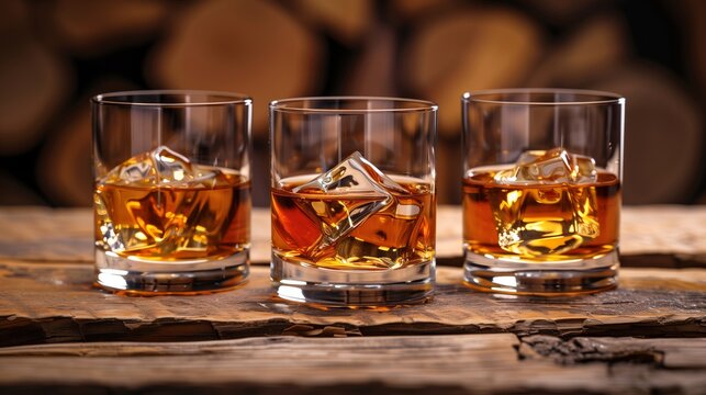 Whiskey in a glass. Three glasses of whiskey or bourbon on a dark table. Whiskey with ice in 3 glasses on the rustic wood background. Strong alcoholic drinks.