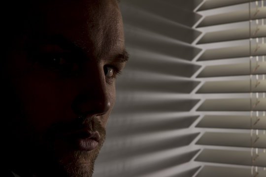 Closeup with narrow warm keylight, dramatic chiaroscuro, surprised gaze, subtle stubble