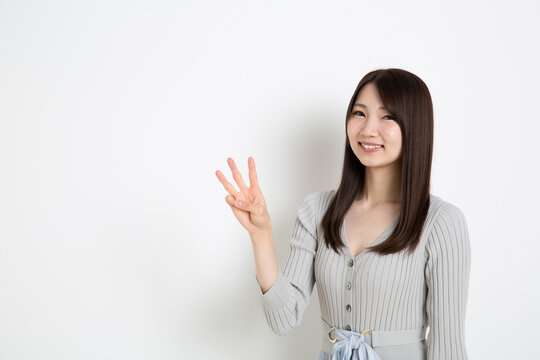 笑顔で指を3本立てている日本人女性