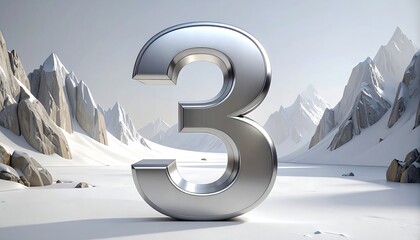 Metallic number three in snowy mountain landscape
