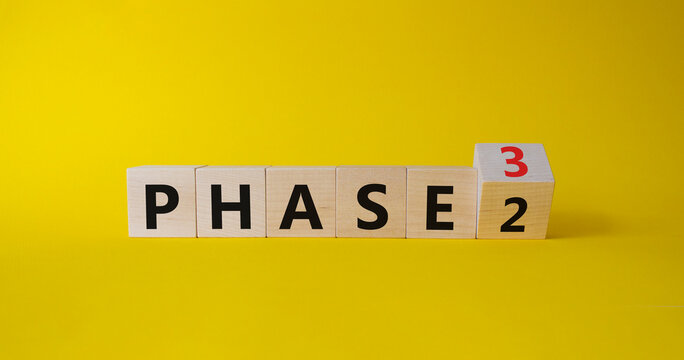 From Phase 2 to 3 symbol. Wooden cubes with words Phase 2 and Phase 3. Beautiful yellow background. Business and Phase concept. Copy space