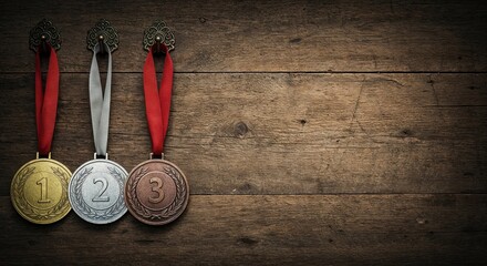 Three prestigious gold, silver, and bronze medals, marked with 1, 2, and 3 respectively, hang proudly on decorative hooks against a textured, dark wooden wall with moody lighting.