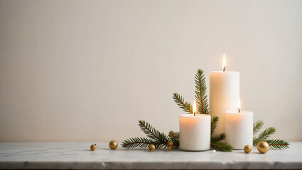 Festive christmas arrangement with three lit white pillar candles and natural evergreen branches creating a warm cozy atmosphere Second Day of Advent