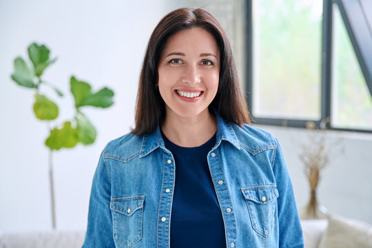 Headshot portrait of smiling woman 30 years old inside room at home