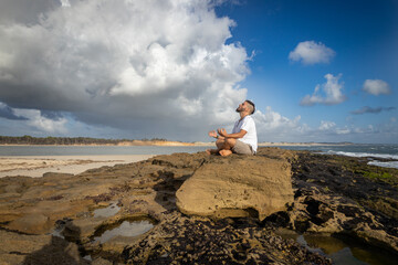 White man between 25 and 30 years old at the edge of the sea doing yoga.