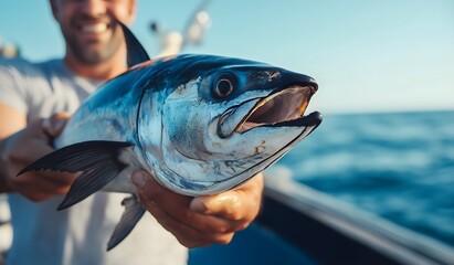 Close up of a happy fisherman holding a fresh caught tuna at sea, with a beautiful blue sky, focused on the face and mouth of a man in his thirties