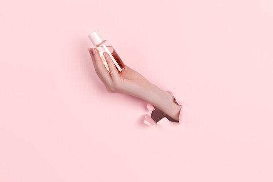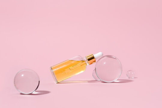 Glass Bottle in female hand with fluid collagen and hyaluronic acid, hydration skin. Copyspace Abstract pink background.