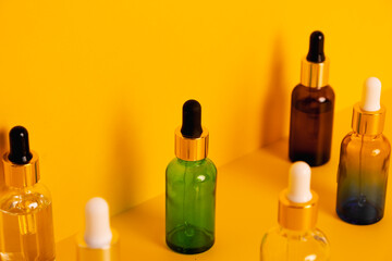 Dropper glass bottles with pipette. Transparent hyaluronic natural beauty mineral product and eco serum skin care concept. Top horizontal view copyspace. Summer juicy colors.