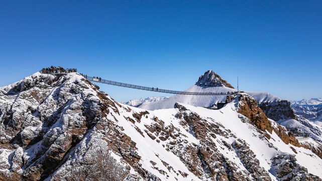 Panoramic Aerial View of Glacier 3000 with Alpine Peaks and Suspended Bridge ( Peak Walk ) in Switzerland
