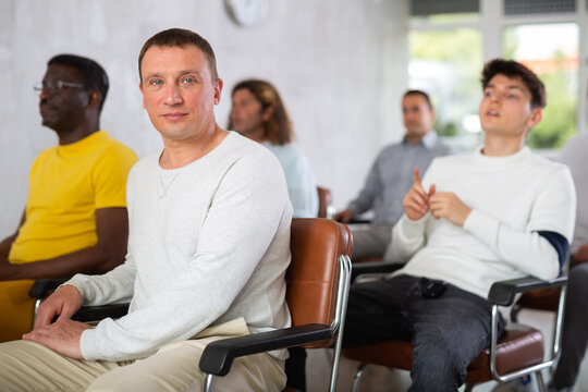 Portrait of a man sitting in a chair during a conference on same-sex relationships