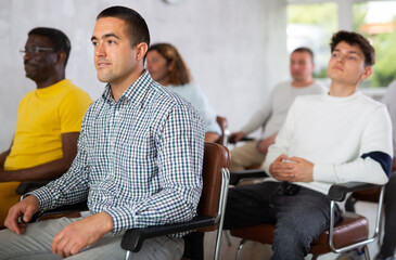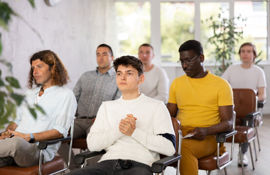 Group of focused men attentively listens to a lecture on same-sex relationships, sitting on chairs in the audience