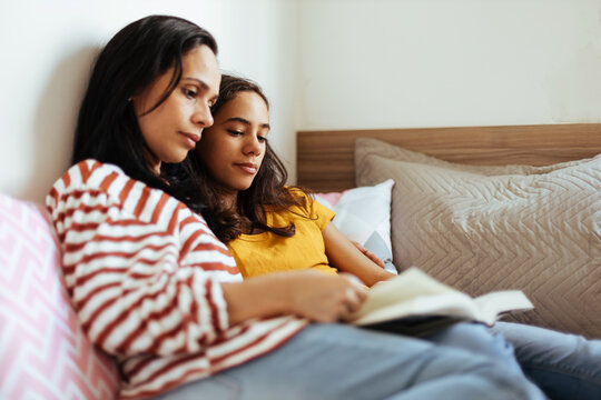 Single parenthood. Mother and daughter reading a book together at home.