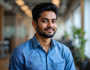 Portrait of smiling attractive Latina female manager, young 30s corporate staff member sitting at desk working online using laptop, exuding confidence, engaged in productive workflow in modern office