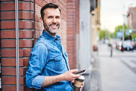 Serious adult man checking smart phone in the street