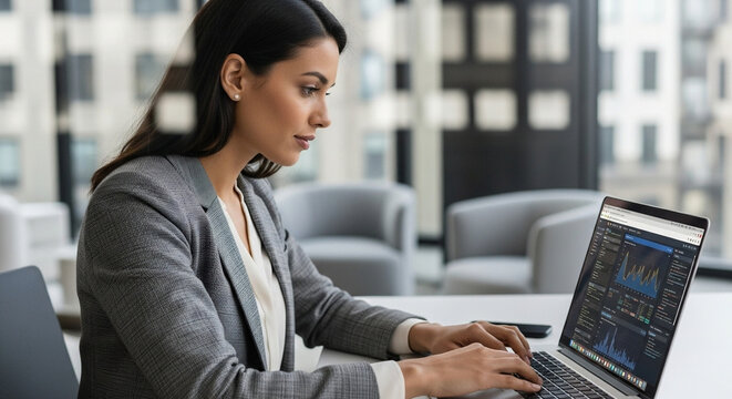 Young professional it specialist latin hispanic business lady working on laptop pc sitting at desk in modern office space. 30s middle eastern indian woman using computer technology app for work online