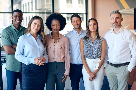 Portrait Of Smiling Multi-Cultural Business Team Standing In Modern Office