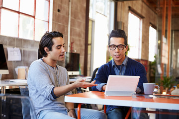 Two Designers Sit At Meeting Table Working On Digital Tablet