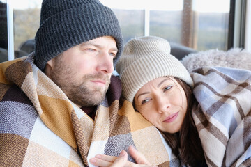 Couple relaxing on a patio wrapped on checkered blankets. Relaxed beautiful woman with a handsome man sitting on wooden cottage terrace. Winter resort. Happy loving couple enjoying leisure, embracing