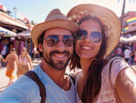 A pair of people smiling and making funny faces while taking a photo of themselves