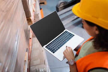 female warehouse worker in hard hat and safety vest using laptop while checking cargo, overhead
