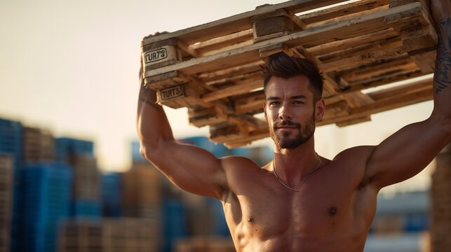A muscular Caucasian man in his 30s with short brown hair carries a wooden pallet on his shoulders. He stands outdoors with a construction site in the background.