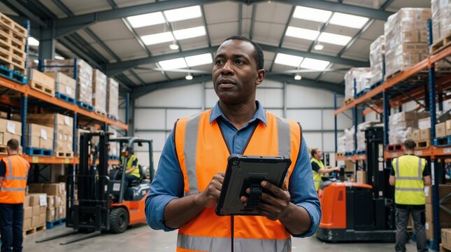 Black man warehouse worker holding digital tablet and looking away in distribution center. Logistics management and industrial supply chain business