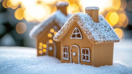 Gingerbread houses covered in snow with warm holiday lights. Merry Christmas, Nativity, Xmas, Noel, Navidad - Global Winter Holiday, Christian Religious Celebration. Happy New Year