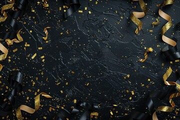 minimalistic design New Years party frame of shiny black and gold black and gold streamers and confetti