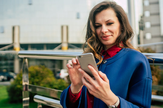 Office buildings city people in suit. Caucasian businesswoman using smartphone with hand. Business concept. Portrait stylish business woman in fashionable clothes holding Phone near office building