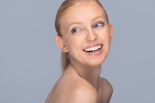 close up of beautiful smiling girl in white Studio. Professional shooting. Mid age woman over 35 years old beauty concept.