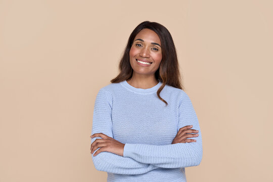 Happy young adult woman in her 30s, smiling African American ethnic beautiful lady wearing blue jumper standing isolated on beige pastel background looking at camera, portrait.