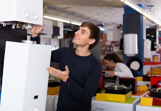 young man choosing new heating water boiler in supermarket